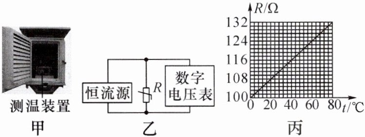 9.(2024·北京)图甲为自动气象站中的测温装置,它的测温电路可简化为图乙,其中的“恒流源”是一个特殊电源,电流大小由电源内部结构决定,当电阻R变化时,通过R的电流大小保持不变。电阻R的阻值随温度的变化规律如图丙所示,通过数字电压表的示数可反映环境的温度。某次环境温度从20℃上升到30℃,电压表的示数变化了8 mV。当温度的变化值相同时,电压表示数的变化值越大,该测温装置的灵敏度越高。下列说法正确的是(