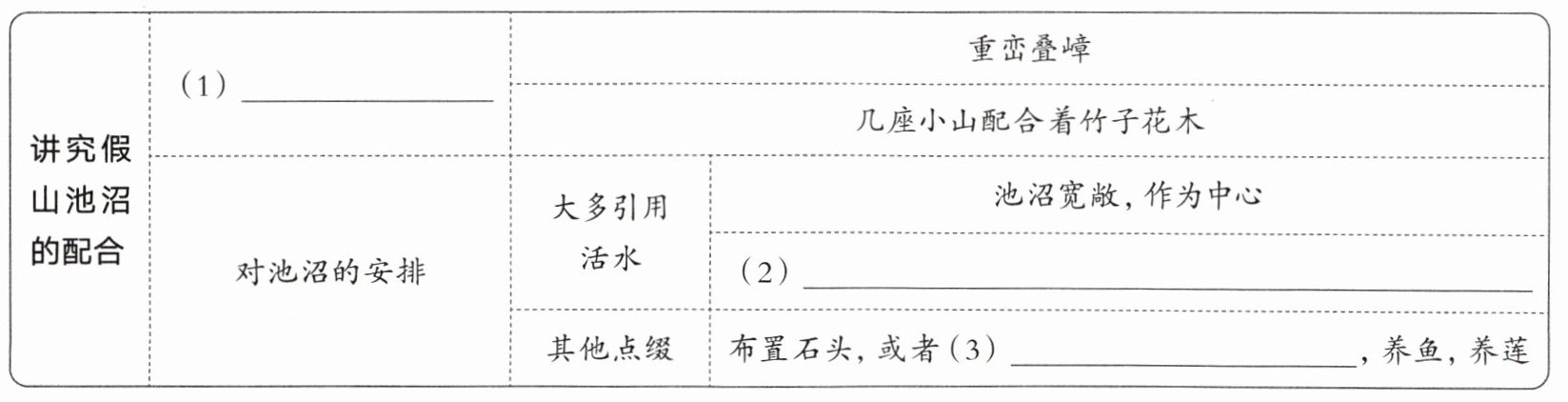 7.(1)假山的堆叠 (2)水面假如成河道模样,往往安排桥梁 (3)种植花草