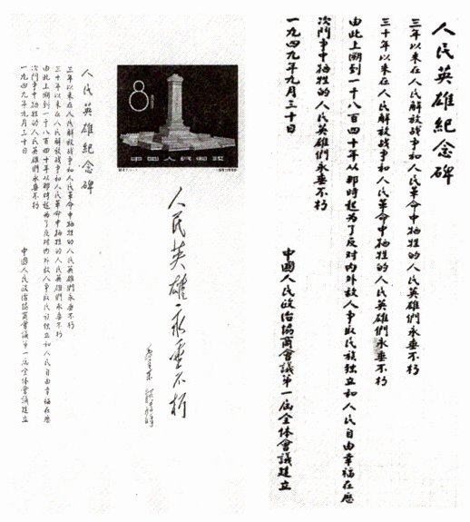 3. 张阳珍藏了一枚《人民英雄纪念碑》的小全张,他将其拿出来,与同学们一起缅怀为民族解放而牺牲的先烈。下列是对小全张中的题词和碑文的判断与理解,正确的一项是(