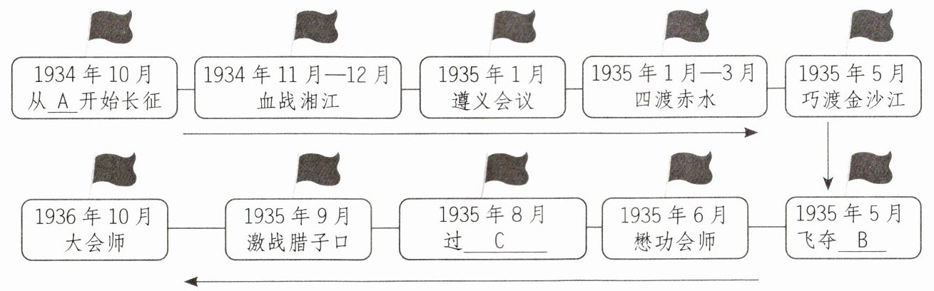 9. 整本书阅读 中国红军长征,就是革命年代的红色马拉松。重走长征路,能让我们铭记历史。下面是同学们绘制的“红军长征路线图”,请你补全 A、B、C 三处的内容。