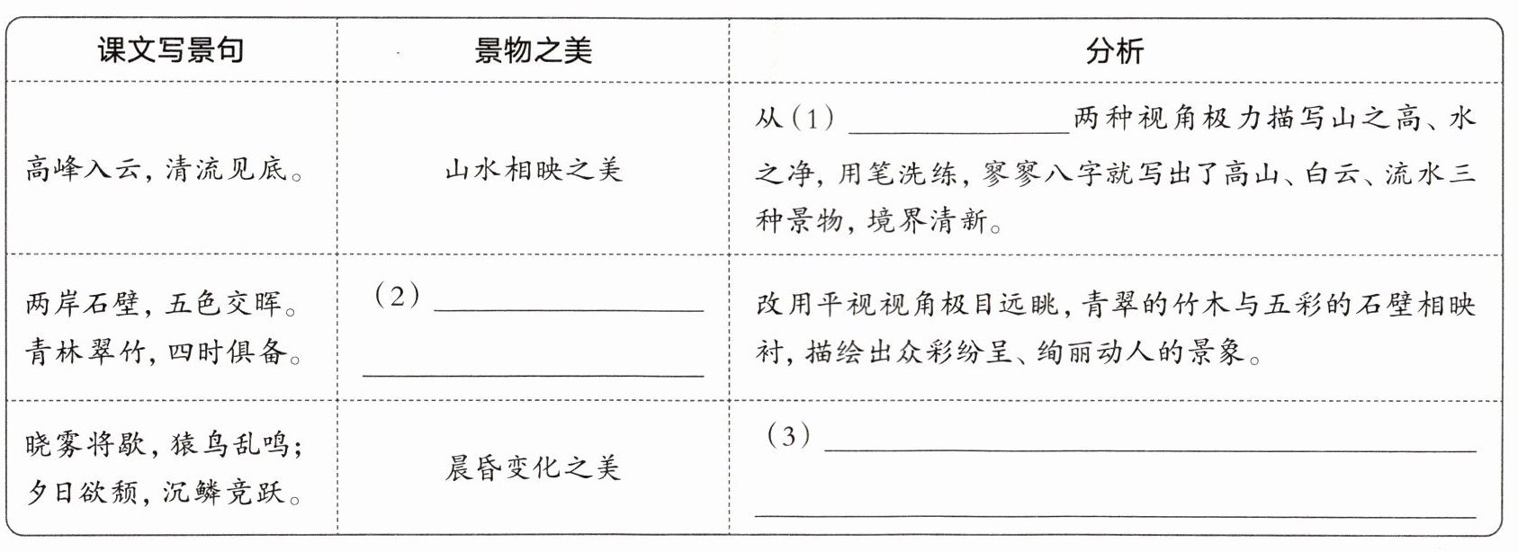 10. 为探究作者是怎样展现“山川之美”的,琳琳结合课文写景句进行了如下梳理,请你补全表格。