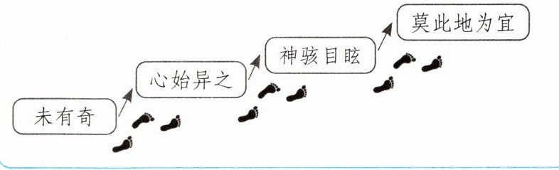 @@示例:作者初入山时,不觉得奇妙;渐渐发现此山草木丰茂、山势高峻、流水铿锵时,方才有了奇异之感;等到看到群山环合,摇摇欲坠,作者神骇目眩,产生了压迫感;最后发现一个幽雅的休息之处,作者与宾客深感适宜。(2分)整个游山过程中,从最初的“未有奇”到最后的“莫此地为宜”产生反转,表达了作者对山水的欣赏与赞美之情。(1分)