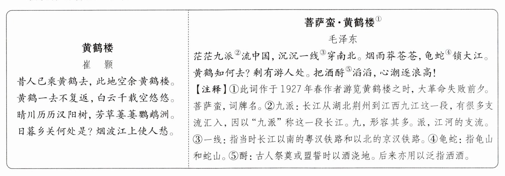 13. 高阶思维 [2025 温州期中] 在诗词联读环节,陆奇查找到毛泽东写的《菩萨蛮·黄鹤楼》。他认为这首《菩萨蛮·黄鹤楼》比崔颢的《黄鹤楼》更胜一筹。你是否赞同他的观点,结合诗词内容,谈谈你的看法。(4 分)