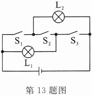 13. (自贡市中考)在如图所示的电路图中,闭合开关$S_1、$$S_3,$断开开关$S_2,$则小灯泡$L_1、$$L_2$的连接方式是