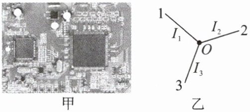 12. [科学推理]如图甲所示,某电子线路板上有多种电路元件,其电路中某一个节点(分支点)O如图乙所示,经测量得知1线路中的电流$I_1$为5mA,2线路中的电流$I_2$为9mA,则3线路中的电流$I_3$(