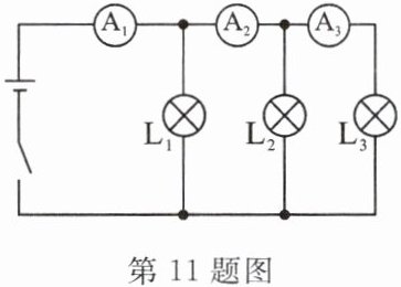 11. 如图所示,电流表$A_1、$$A_2$和$A_3$的示数分别为1.2A、0.8A和0.3A那么通过$L_1$的电流为