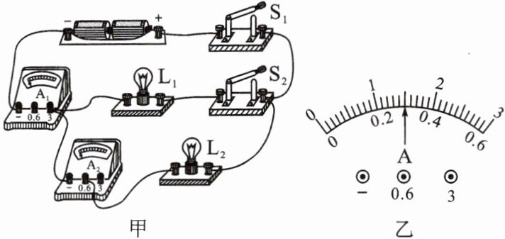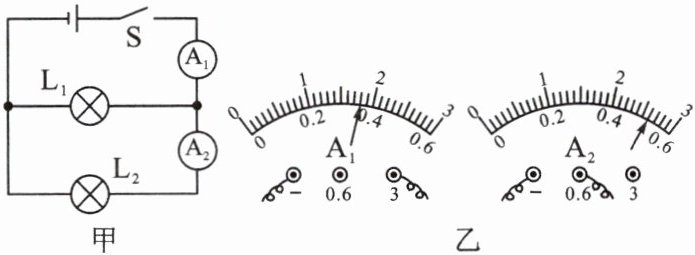 7. 如图甲,当开关S闭合时,两个电流表的示数如图乙所示,则通过灯$L_1$的电流是(