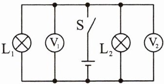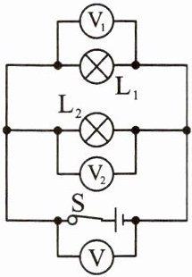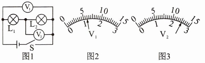 12. [科学推理]如图1所示的电路中,当开关闭合后$,V_1$和$V_2$的示数分别如图2和图3所示。则小灯泡$L_1$两端的电压是