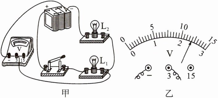 10. 如图甲所示电路中,电压表测量的是______(选填$"L_1"$或$"L_2")$两端的电压,电压表 的示数如图乙所示,若电源电压为6V,则灯$L_1$两端电压为______V。