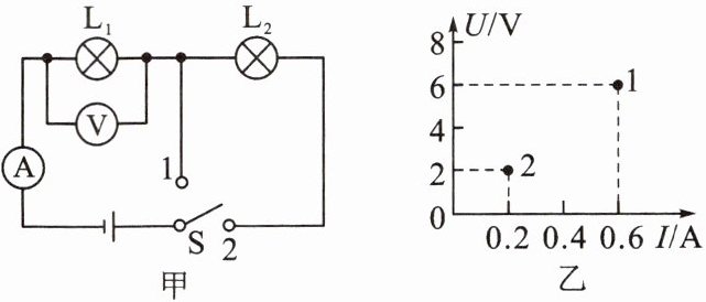 11. 如图甲所示,当开关S由接1转换到接2时,电压表与电流表的示数变化如图乙所示,则开关S接2时$,L_2$两端的电压是