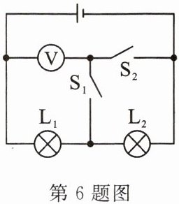 6. 如图所示,电源电压保持不变,当开关$S_1$闭合$,S_2$断开时,电压表示数为4V;当开关$S_1$断开$,S_2$闭合时,电压表示数为6V,则$L_1$和$L_2$两端电压分别是(