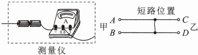 13. [科学探究]甲、乙两地相距 30km,在甲、乙两地之间沿直线架设了两条输电线,已知输电线的电阻与其长度成正比,现输电线在某处发生了短路,为确定短路位置,甲地检修员先用如图所示的测量仪接入 A、B 时,电流表的数据为0A地修员后用相同的测量仪接入 C、D时,电流表的示数为0.3A。则短路位置离甲地(