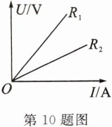 10. 在“探究电流与电压关系”的实验中,分别用 $ R_1、R_2 $ 两个电阻进行探究,并根据各自的实验数据绘制了如图所示的 $ U-I $ 关系图像,由图像可以得出 $ R_1 $ 与 $ R_2 $ 的大小关系是(