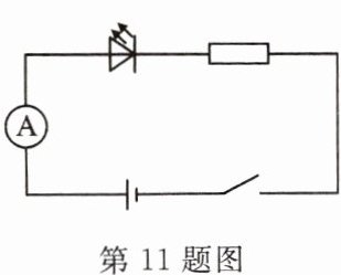 11. 二极管具有单向导电性。如图所示,将一个硅二极管和阻值为 23$\Omega$ 的定值电阻串联,闭合开关,二极管导通,其两端电压为 0.7V,电流表的示数为 0.1A。则定值电阻两端的电压为