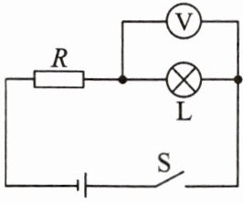 8. 如图所示,电源电压 $ U= 10V $,定值电阻 $ R= 20\Omega $,闭合开关 S,电压表的示数是 6V,通过小灯泡的电流是(