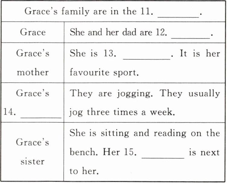 | They are jogging. They usually jog three times a week. || Grace's sister | She is sitting and reading on the bench. Her 15.