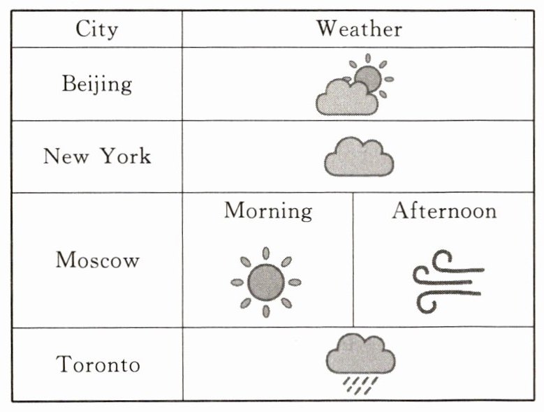Good morning, everyone! Here is the weather report of some big cities. In Beijing, it will be partly cloudy. New York will have a cloudy day. Moscow will be sunny in the morning but windy in the afternoon. Toronto will see rainy weather. That's the weather for these cities. Have a nice day!