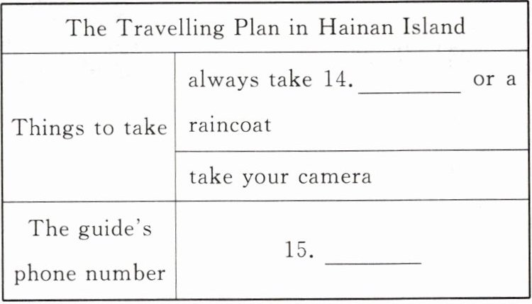 11. 7/Seven. 12. bus 13. hot and wet 14. an umbrella 15. 8539275