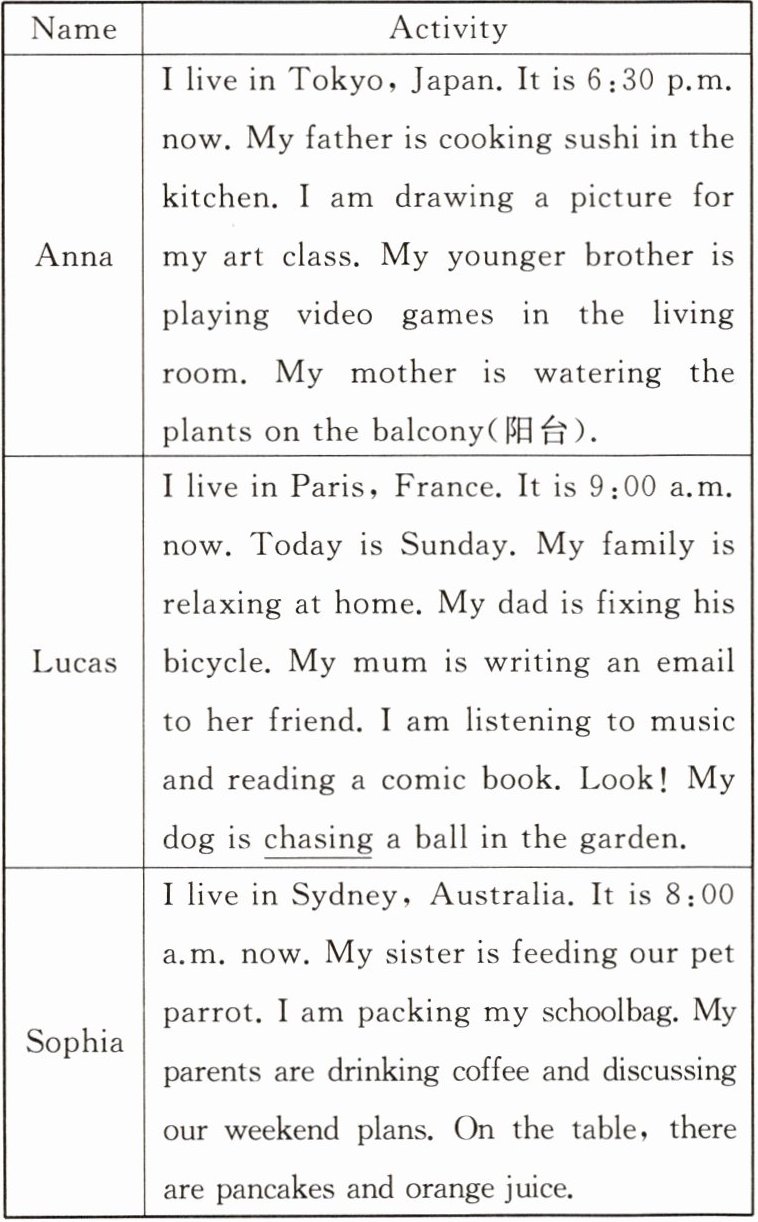 | Anna | I live in Tokyo,Japan. It is 6:30 p.m. now. My father is cooking sushi in the kitchen. I am drawing a picture for my art class. My younger brother is playing video games in the living room. My mother is watering the plants on the balcony(阳台). |