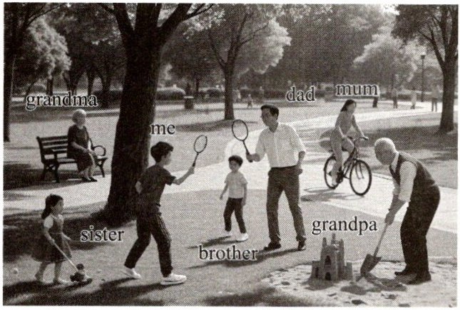 It's four o'clock in the afternoon now. Look! My family are in the park. My grandma is sitting on a bench and resting. My grandpa is making a sandcastle with a shovel. My dad and I are playing badminton. My little brother is standing beside us and watching. My sister is playing with a toy shovel. My mum is riding a bike happily. We are having a good time!
