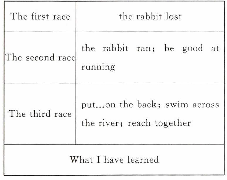 The rabbit paid more attention to their second race,and he didn't sleep at all in it. At last he won the race because he was good at running. Then the rabbit and the tortoise had the third race. At first the rabbit ran faster than the tortoise. Shortly after there was a wide river ahead of it. The rabbit had no idea of how to cross the river. The tortoise got to the riverbank,too. He put the rabbit on his back,and they swam across the river. They reached the finishing line at last. I can learn the spirit of teamwork from the story. If we help each other,the world will be more beautiful.