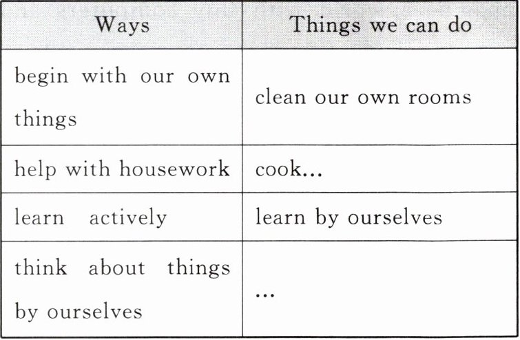 由于父母的溺爱,现在许多孩子基本不做学习以外的事情,导致独立生活能力不强。请你根据下面表格中的内容,按要求用英语写一篇70词左右的短文,谈谈我们应该如何培养自己的独立性。