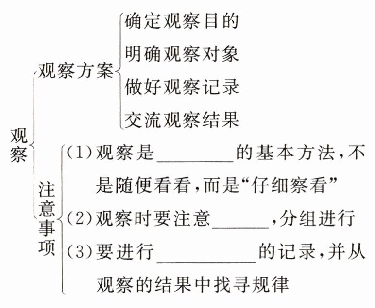 观察是科学探究的一种基本方法。观察可以直接用肉眼,也可以借助放大镜、显微镜、望远镜等,或利用照相机、摄像机、录音机等设备,有时还需要测量。科学的观察要有明确的目的;观察要按照一定的顺序进行,并做好记录;观察时要有计划和耐心;观察过程中要积极思考,还需要同别人交流看法、进行讨论。