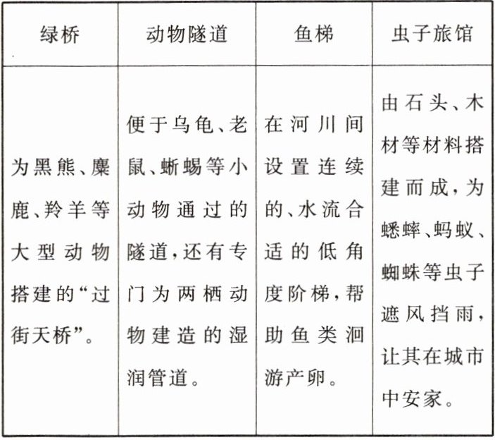 13. 修建道路方便了人类的生活,但给野生动物的觅食、迁徙、繁殖等活动带来了较大影响。为更好地保护野生动物,下表中的动物通道应运而生。请据表回答下列问题。