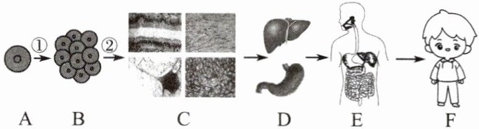 8. 下图中,A~F表示人体的不同结构层次,据图回答下列问题。