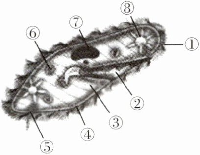 【思路剖析】草履虫身体的一侧有一条凹入的小沟,叫口沟,口沟相当于草履虫的“嘴巴”。口沟内的纤毛摆动时,能把水里的细菌和有机碎屑摆进口沟,这些细菌和有机碎屑再进入草履虫体内,形成食物泡,供其慢慢消化吸收。在草履虫培养液中加入适量红墨水,红墨水会随食物通过口沟进入草履虫体内的食物泡中,因此最有可能被染成红色的结构是食物泡。