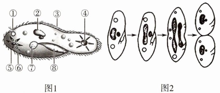 8. 草履虫是一种生活在水域环境中的单细胞生物。图1为草履虫的结构示意图,图2表示草履虫的分裂过程。请分析并回答下列问题。