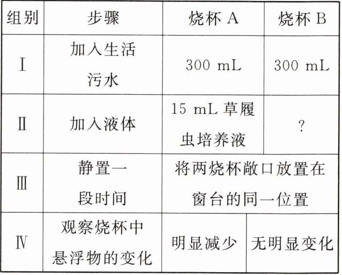 (2)为了研究草履虫是否可以净化水质,同学们收集生活污水,摇匀后分别放入两个烧杯,处理步骤见下表。