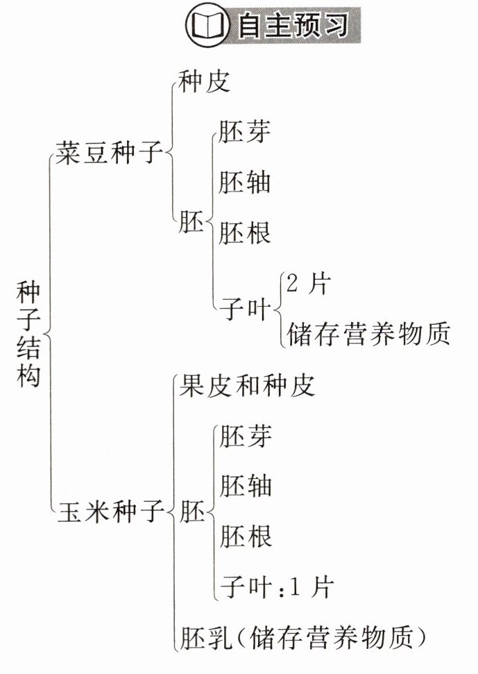 种子结构包括菜豆种子(种皮、胚:胚芽、胚轴、胚根、2片子叶储存营养)和玉米种子(果皮和种皮、胚:胚芽、胚轴、胚根、1片子叶、胚乳储存营养)
