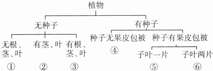 7. 某生物兴趣小组的同学在进行野外考查时,采回植物肾蕨、油松、葫芦藓、向日葵、玉米、水绵并制成了标本,他将这些生物按照下图所示的方式进行了分类。请据图回答下列问题。