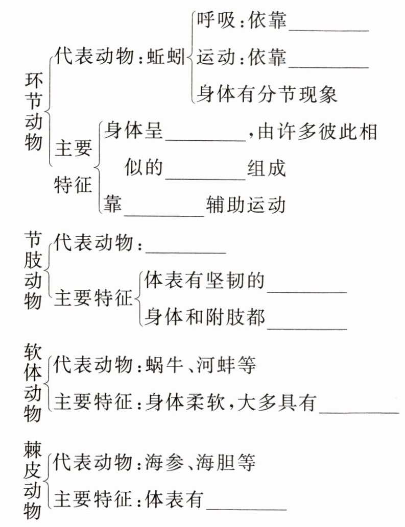 湿润的体壁;肌肉和刚毛;圆筒形;体节;刚毛或疣足;蝗虫(或其他合理节肢动物);外骨骼;分节;贝壳;棘