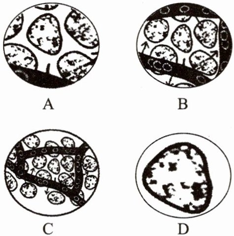 7. 若用一台显微镜观察同一标本四次,每次仅调整目镜、物镜和细准焦螺旋,结果得到下列各图,其中视野最暗的是(