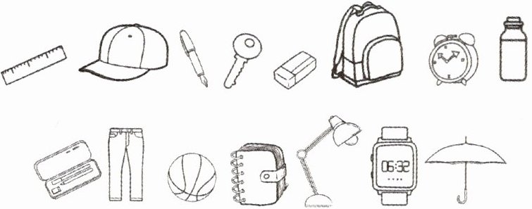 你拥有下图中的哪些物品?他们是什么颜色的?用彩笔给你所拥有的物品涂上颜色,并用英语向你的同学介绍。