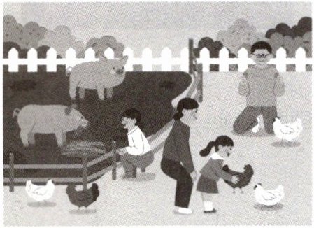 This is a picture of a farm. There is a white fence around the farm. In the picture, I can see two pigs behind the fence. There is a boy sitting on a wheelbarrow. Near the boy, there are two chickens on the ground. In front of the boy, a girl is holding a chicken in her hands. There is also a man standing beside the girl, and another chicken is near the man. The scene is very lively and interesting.