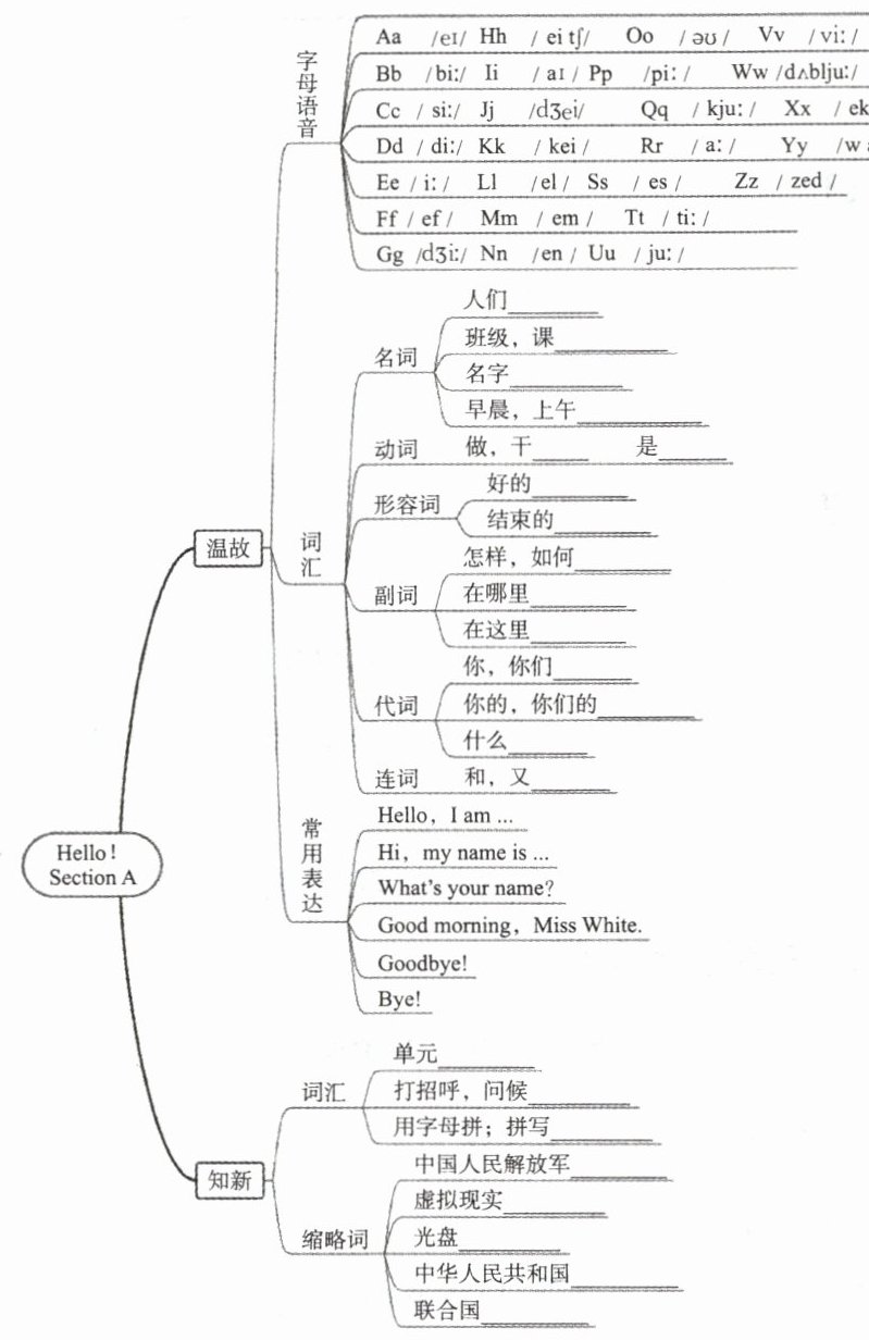 字母语音部分无需额外填写;词汇:名词:people, class, name, morning;动词:do, be;形容词:good, fine;副词:how, where, here;代词:you, your, what;连词:and;单元词汇:greeting, spell;缩略词:PLA, VR, CD, PRC, UN