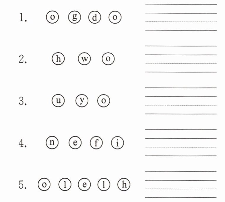 (二)将各组字母重新排序,组成本单元所学的单词。