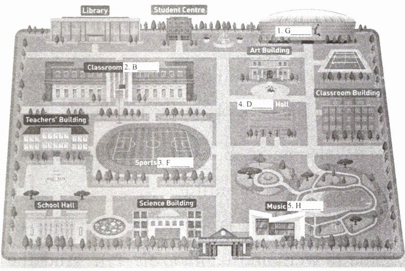 1. Gym 2. Building 3. Field 4. Dining 5. Hall