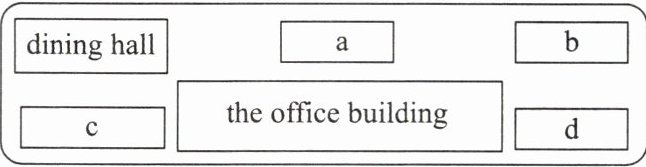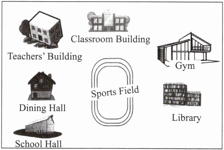 This is a map of our school. There are 7 1. b______ in our school. In the middle of the school is the 2. ______. It is very 3. l______. We often play soccer over there after school. And behind it is our 4. ______. It is between the teachers' building and the gym. The library is 5. ______ of the gym. There are many books and computers in it. The dining hall is 6. ______ the library. We usually have lunch in it.
