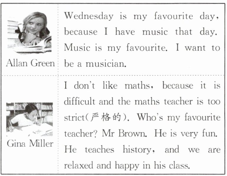 )5. According to the table, which is NOT true?A. Allan's favourite subject is music.