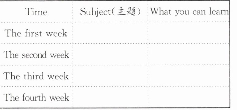 本月你们组轮值班级综合实践课主持人,小组讨论这个月的课程并用英语填写下表。