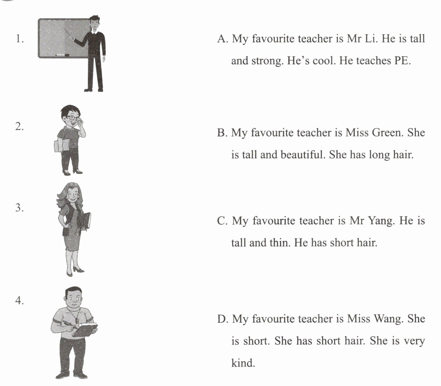 参考词汇:short/tall, long/short, kind/strict, big/small, cool, beautiful