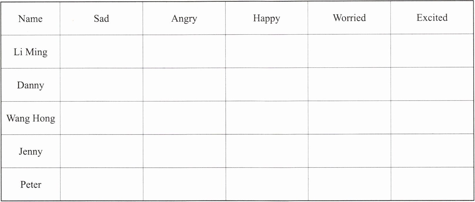Li Ming: worried √ Danny: excited √ Wang Hong: sad √ Jenny: angry √ Peter: happy √