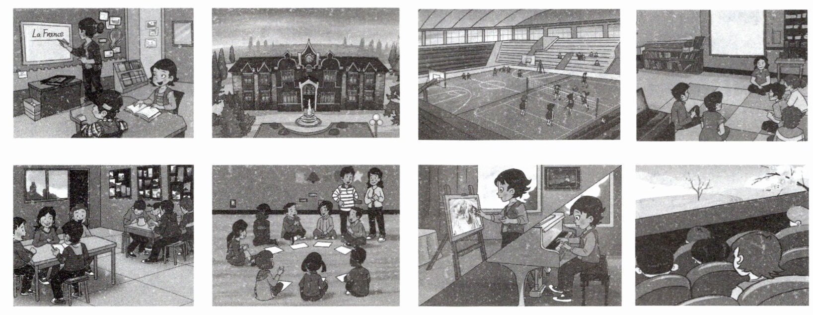 1. big 2. maths 3. gym 4. pictures 5. making 6. sing 7. draws 8. watches