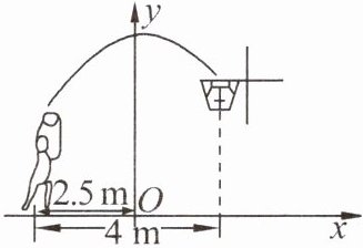 4. 一位运动员在距篮下 $ 4 m $ 处跳起投篮,球运行的路线是抛物线.当球运行的水平距离为 $ 2.5 m $ 时,达到最大高度 $ 3.5 m $,然后准确落入篮圈.如图,建立平面直角坐标系.已知篮圈中心到地面的距离为 $ 3.05 m $,该运动员身高 $ 1.9 m $.在这次跳投中,球在头顶上方 $ 0.25 m $ 处出手时,他跳离地面的高度是(