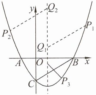 【点拨】解方程$\dfrac{1}{2}x^{2}-\dfrac{3}{2}x - 2 = 0$,可得$A(-1,0)$,$B(4,0)$,易得$C(0,-2)$.该抛物线的对称轴为直线$x= \dfrac{3}{2}$.讨论:当$BC$为边时,四边形$BCQ_{1}P_{1}$为平行四边形,把$B点向右平移\dfrac{3}{2}个单位得到P_{1}点的横坐标为4+\dfrac{3}{2}= \dfrac{11}{2}$,则计算$x= \dfrac{11}{2}时对应的函数值得到P_{1}$点的坐标;当$BC$为边时,四边形$BCP_{2}Q_{2}$为平行四边形,把$C点向左平移\dfrac{5}{2}个单位得到P_{2}点的横坐标为0-\dfrac{5}{2}= -\dfrac{5}{2}$,则计算$x = -\dfrac{5}{2}时对应的函数值得到P_{2}$点的坐标.
