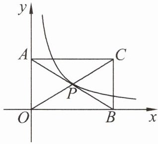 8. 如图,矩形$AOBC的面积为4$,反比例函数$y = \frac{k}{x}的图象的一支经过矩形AOBC的对角线的交点P$,则该反比例函数的表达式是(